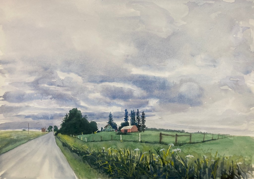 Very nice country scene. As with some of your other paintings, I want to crop off the top 25% of this one. (Sometimes I want to crop from the bottom 25%). The balance of sky and land works better for me without that much sky and when cropped by covering the top with my ruler, I notice more of the farm scene. It feels like I enlarged the painting.