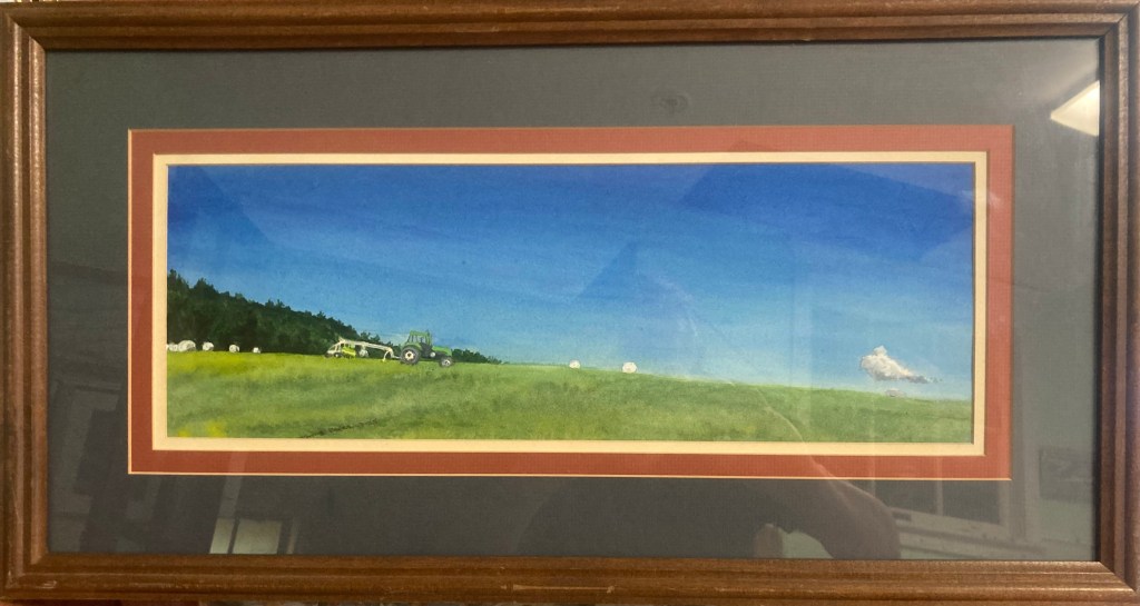 I rode yesterday and found this haying operation on Swartwood Hill Rd. near Erin NY. I framed it before the photograph so there’s reflections. Sorry. But it is a fine piece. 25 3/8″ x 13 3/8″ in the frame. It’ll be at the artist’s market on the 8th of August. I do hope you will all be able to come by and check in on me and this last year’s prized paintings.