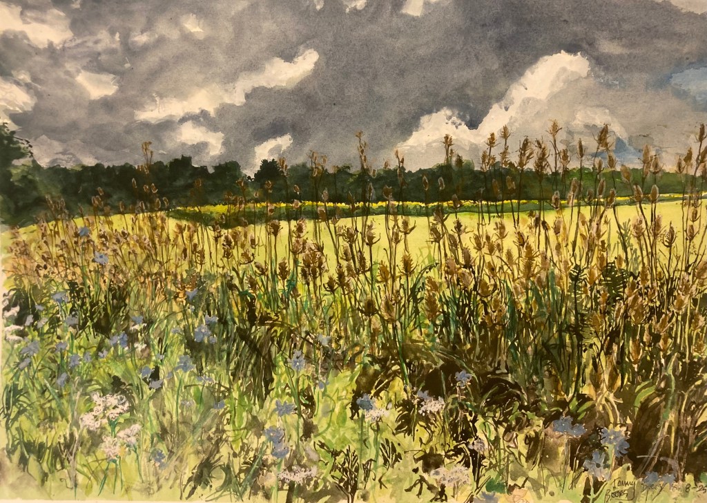 I got out to ride last Friday and after visiting a friend in Spencer found myself on Gridleyvillle Rd where I came upon this interesting arrangement of wildflowers. There’s chicory, queen Annes lace and teasel galore. It’s 20″ x 14″ using pencil, watercolor and gouache on Waterford 140# paper. $110 unframed.