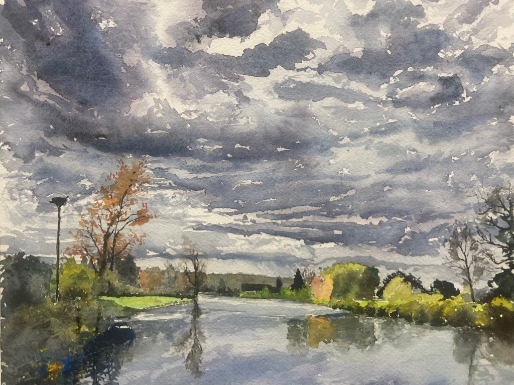 Walking along our waterfront trail in late afternoon this was the view proferred from the bridge over Fall Creek. There’s some vestiges of fall color hanging on and the clouds appear to be harbingers of the cold season to come. And it did snow a day later. This is 12″ x 12″ and will be framed and available at the Southside Community Center’s fundraiser this coming Saturday from 12 noon till 4 PM. I hope you can come and support their efforts working with children and youth all year round. (and my efforts too)