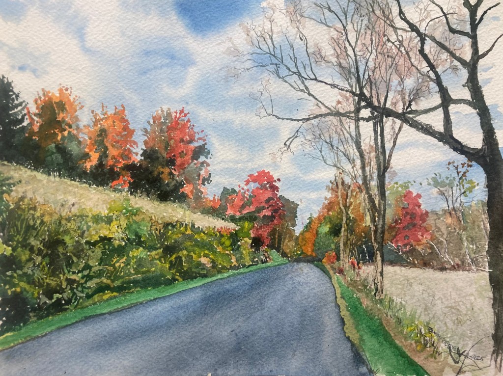 When I rode to Fairhaven I came upon some real fall color, some of the best I’ve witnessed this season past. This is a road that I’ve never seen any traffic on whatsoever. It’s got a couple of steep climbs, steep enough to remind me how wimpy I am these days. Macneeley Rd. is its name and you might like to accompany me next ride to the big lake and see for yourself how wonderful the journey can be. This is 12″ x 9″ using pencil, pen and watercolor on Arches paper. It’ll get framed and be $150