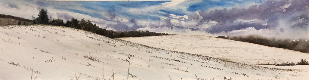Second day of the new year and here’s the second painting. I walked thru LPBP preserve in the cold but sunny day…nice light, nice rolling fields, nice clouds. Crunching snow and frozen ponds were part of the gestalt. This is 30″ x 8″ using pencil, pen and watercolor on cotton paper and framed it’ll be $150.