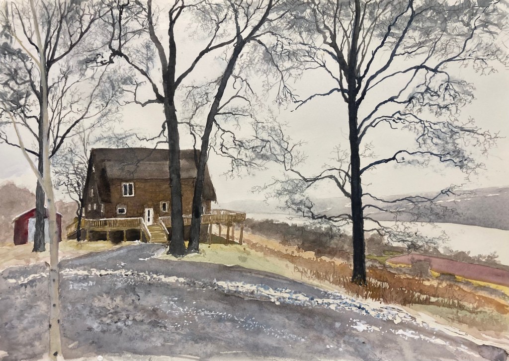 Here’s a wintry piece. It might be a commissioned work if the owner likes it enough. It’s Anita’s new B’n’B On Shumway Rd. Big views, big deck. It’s 20′ x 14′ using pencil and watercolor on cotton paper.