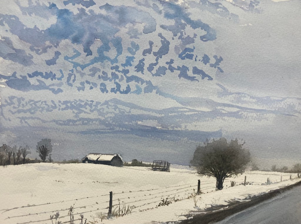 This is, once again, the top of the hill on Tuttle Rd…the other side of the road from yesterday’s painting. Same grey day and the same wonderful clouds. I’m looking forward to some warmer weather and less snow. $75 unframed.
