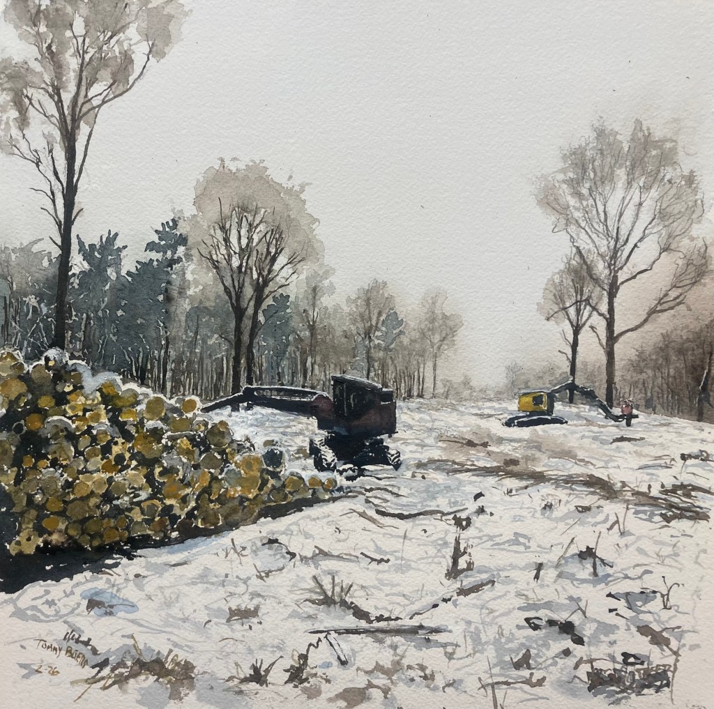 Some people have probably seen this devastation on Connecticut Hill on Tower Rd. I stumbled on it yesterday. I know there were some lovely hiking trails across this area that I used a lot so it’s painful to see the mess left after the clearcut. This is equipment from a very large operation. We saw them last winter over on the Hector Backbone and now they’re here on Conn. Hill. I am documenting the tree removal…that’s all. 12″ x 12″ using pencil, gouache and watercolor on Arches paper. $100 unframed